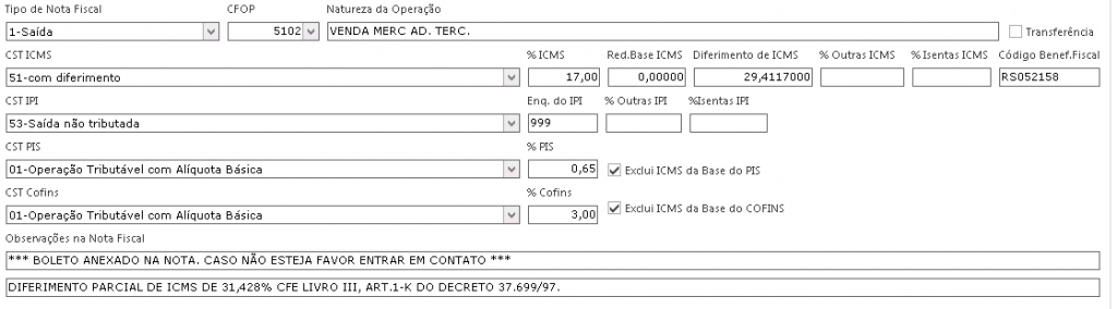 Quando a CST do ICMS for 51, alterar o % Diferimento do ICMS para 29.4117.